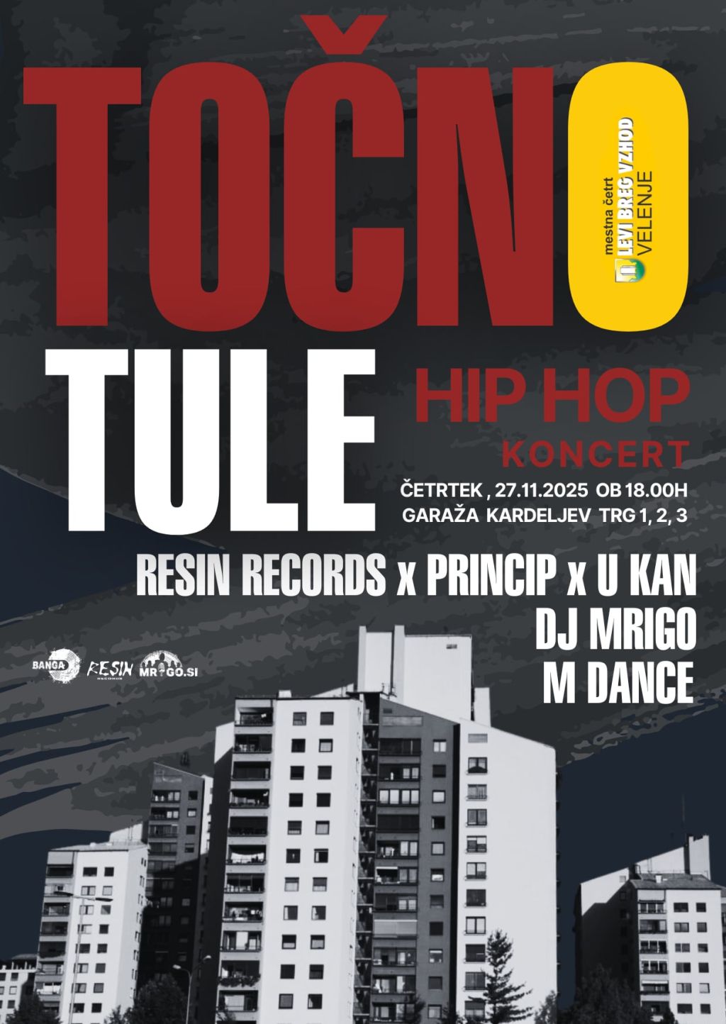 Mestna četrt Velenje – Levi breg vzhod bo v četrtek, 27. novembra, od 18. ure dalje v garažah na Kardeljevem trgu 1, 2 in 3 pripravila dogodek ob zaključku prenove. S koncertom Točno tule bo prostor zaživel v hip-hop ritmih in tako bodo simbolično obeležili prenovljeno, osveženo podobo garažnega kompleksa. Na koncertu bodo nastopili Resin Records, Princip, U Kan, DJ Mrigo in plesna skupina M Dance.