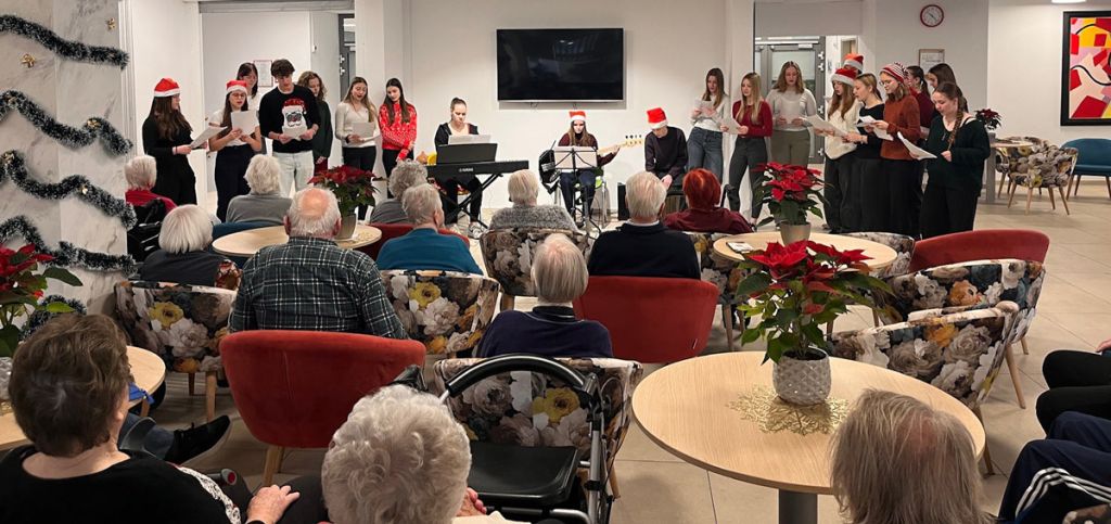 Velenje, 22. decembra ‒ Praznični obisk je bil v prvi vrsti namenjen sproščenemu medgeneracijskemu druženju. Dijaki glasbeniki so program začeli s krajšimi komornimi glasbenimi točkami, ki so ustvarile prijetno in umirjeno vzdušje. Glasba je hitro postala povezovalni most med mladimi in starejšimi, kar se je še posebej pokazalo pri skupnem petju slovenskih popevk in prazničnih pesmi, med katerimi so zazvenele Mlade oči, Orion, Na božično noč, Silvestrski poljub ter Sveta noč. Skupno petje je v prostor prineslo občutek domačnosti, topline, srčnosti in iskrenega veselja.