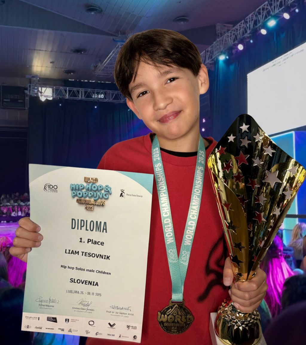 Velenje, 3. novembra – Na letošnjem svetovnem prvenstvu IDO v hiphopu, ki je potekalo v ljubljanski Hali Tivoli in na katerem so tekmovali najboljši plesalci iz kar 33 držav, je 11-letni Liam Tesovnik iz Mozirja dosegel izjemen uspeh. Med 56 tekmovalci v kategoriji Hiphop solo dečki je osvojil zlato medaljo in poskrbel za prvi zven slovenske himne na štiridnevnem tekmovanju. Liam, ki je lani pri desetih letih osvojil drugo mesto na svetovnem prvenstvu v Skopju, je s trdim delom skupaj s trenerjem Renejem Abramom letos dosegel vrh. Poleg solo nastopa je tekmoval še v treh drugih kategorijah – duo, mala skupina in formacija – kjer je prav tako dosegel odlične rezultate.