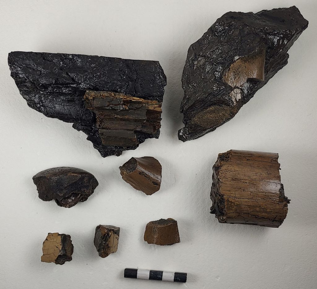 Največji kos okla ter fragment kosti, ki je ujeta v kosu premoga, sta v delavnico prispela preparirana; rudarji so ju premazali s prozornim lakom (po informacijah iz druge roke so ju utrdili z lakom za plovila). Začasni premaz na kosu okla ter vanj ujete drobce premogovega prahu smo odstranili z acetonom, površino pa nato utrdili s tremi premazi 5 odstotne raztopine Paraloida B 72 v acetonu ter končnim premazom z 10 odstotko raztopino Paraloida B 72 v acetonu. Potencialno nevarne razpoke v težkem kosu okla so bile zapolnjene z epoksidnim kitom. Del kosti, ujet v kosu premoga je bil utrjen na enak način, le da je bil v tem primeru z epoksidnim kitom utrjen drobljivi kos premoga. Utrjen je bil še z dodatnimi premazi omenjenih utrjevalnih raztopin.